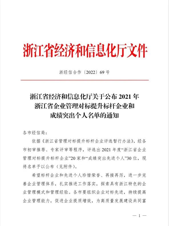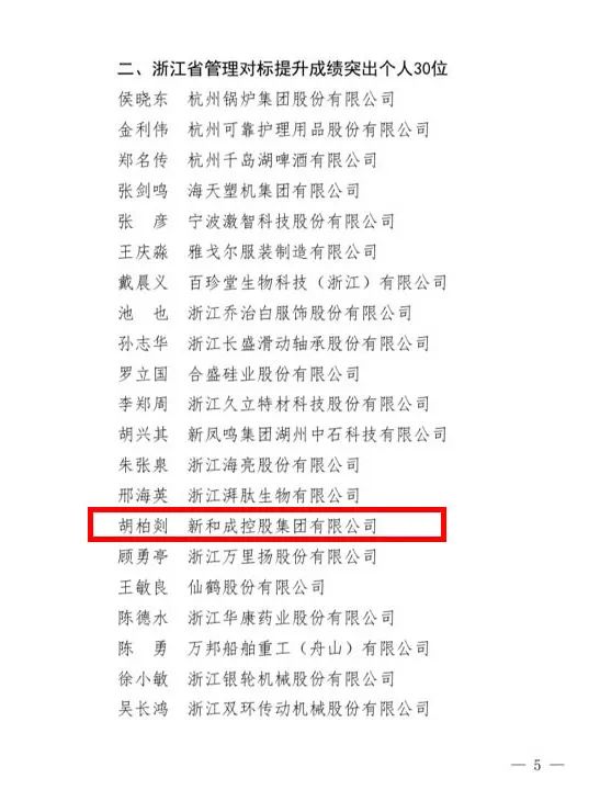 近日,浙江省經(jīng)濟和信息化廳公布2021年浙江省企業(yè)管理對標提升標桿企業(yè)和成績(jì)突出個(gè)人名單。集團公司黨委書(shū)記胡柏剡老師榮獲“企業(yè)管理對標提升成績(jì)突出個(gè)人”稱(chēng)號,這不僅是對胡柏剡老師在推進(jìn)企業(yè)高質(zhì)量發(fā)展方面做出突出貢獻的嘉獎,也是對新和成發(fā)展成果的肯定。