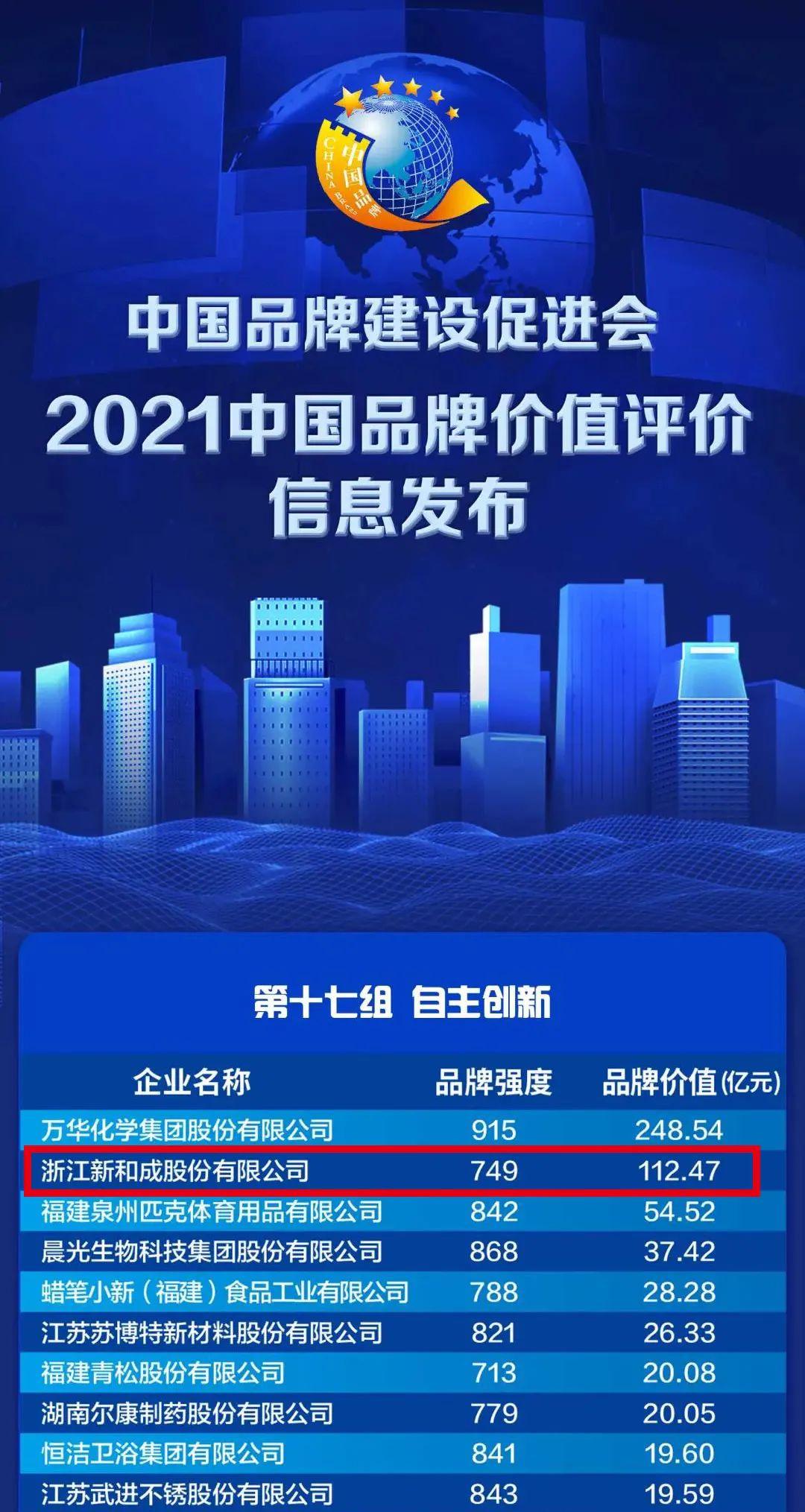 5月9日,中國第五個(gè)“中國品牌日”來(lái)臨之際,“2021中國品牌價(jià)值評價(jià)信息發(fā)布暨中國品牌建設高峰論壇”在上海國際會(huì )議中心舉行。會(huì )上發(fā)布了中國品牌價(jià)值評價(jià)信息,新和成以品牌強度749、品牌價(jià)值112.47億元位列“自主創(chuàng )新”榜單第二位。