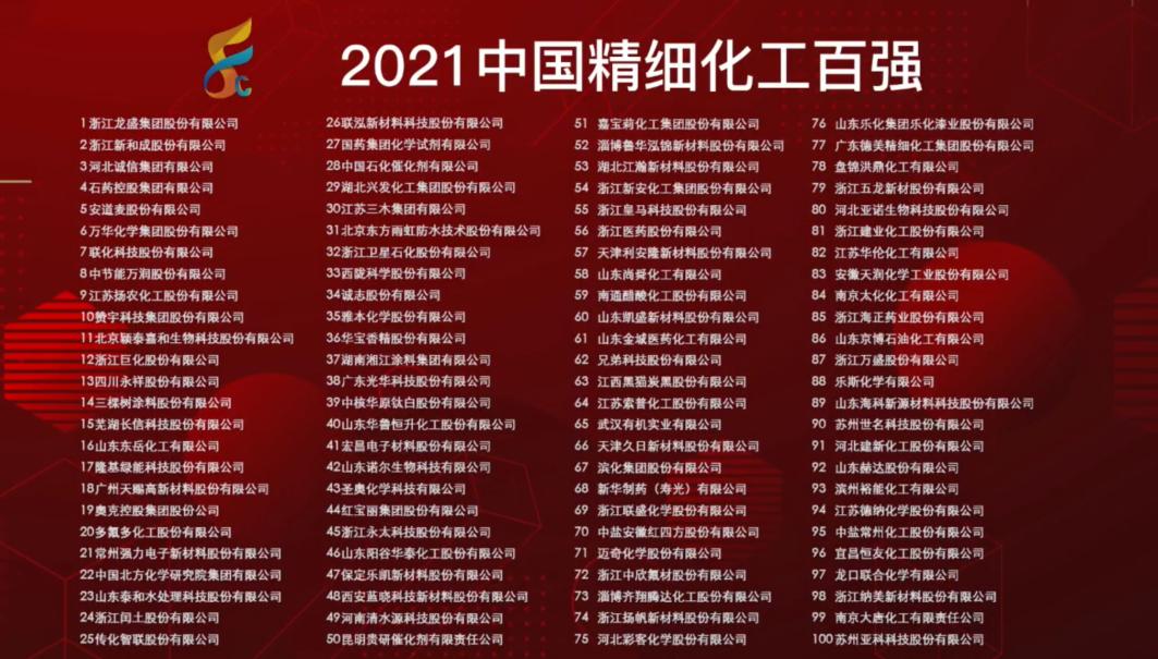 4月27日,“2021精細化工產(chǎn)業(yè)峰會(huì )暨中國精細化工百強發(fā)布會(huì )”以線(xiàn)上方式舉行。會(huì )議發(fā)布了“2021中國精細化工百強”榜單,新和成股份公司蟬聯(lián)榜單第二。